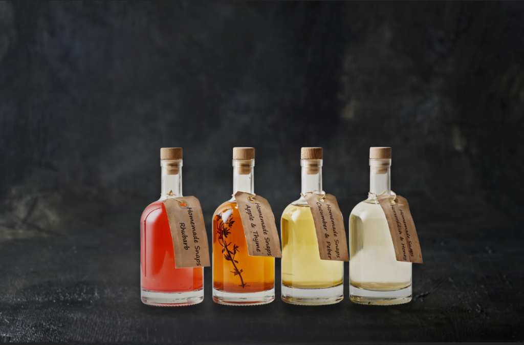 Hjemmelavet snaps i mange varianter, fx. rababer, æble/timian, agurk/peber 35,-/glas
